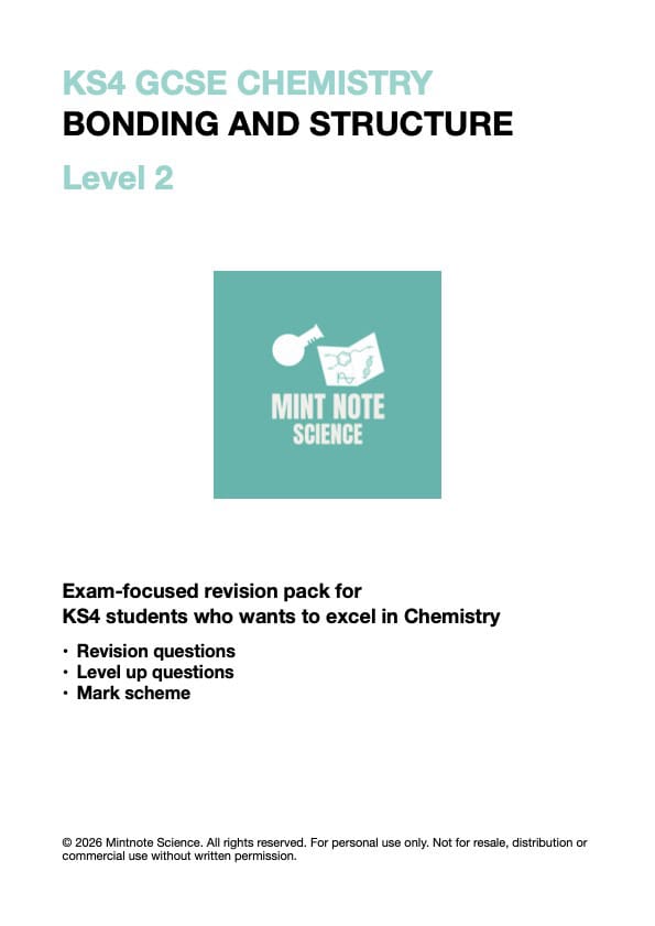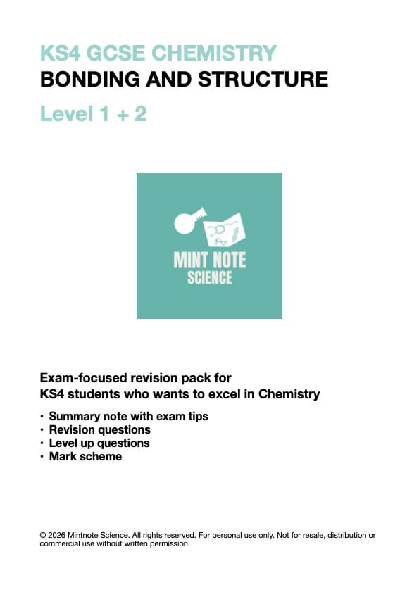 Elementor Page #1319 GCSE Chemistry Bonding & structure Level one Summary note with exam tips Link Level two Revision questions, Exam-style questions & Full mark scheme Link Level one & two All-in-one Link